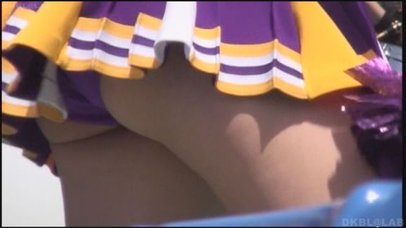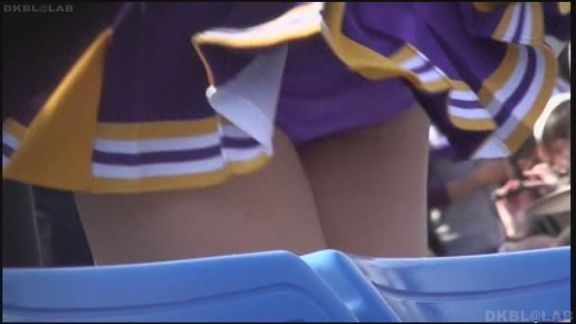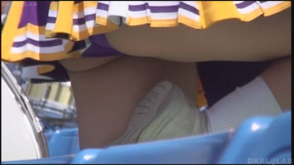 再び上半身野球ユニ風、下半身は白単色のスカート娘の姿。シンプルな単色白ミニスカのひらひらがすごい。普段はチアユニ娘はくるぶしソックスが好みな筆者ですがこの野球ユニ風チア娘は野球選手が履いているようなハイソックスを着用、これが単調なスカートのフォローを見事にしていてよく似合っています。後半は紫系ユニの再びのすごいアングルかなりの角度撮影。