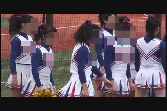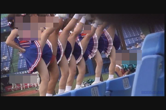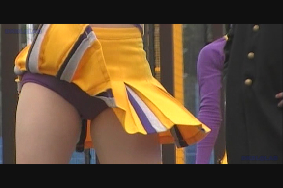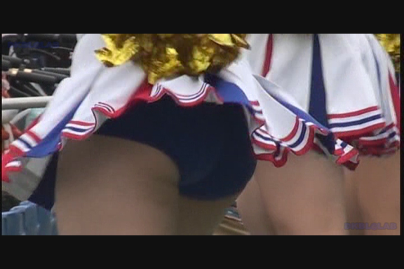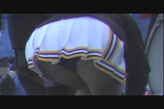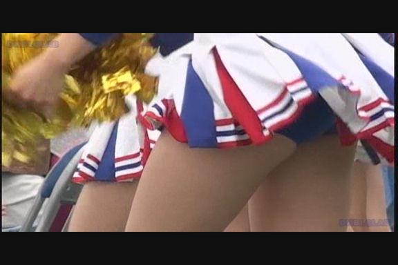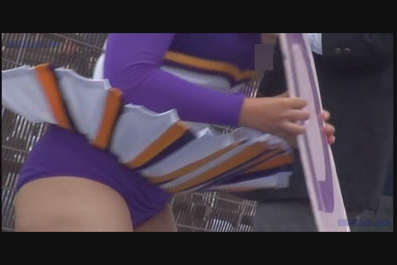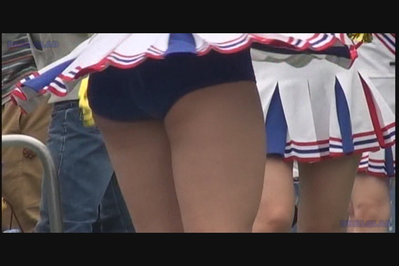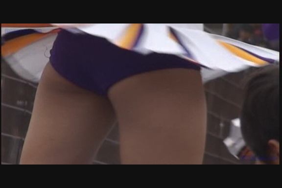 スリット短冊スカート青みの強い紫Vアンダーチームが先頭から登場。 同じ丈の長さでも短冊形スカートはひらりシーンでのご開帳度が5割増しくらいになります。 くるぶしまでの短い白ソックスも清潔感があっていい。 後半もほぼ同じ色遣いのチームになりますがこちらは通常のプリーツスカート。 しかしチア嬢との距離が近くフレームいっぱいにVアンダーからこぼれた尻肉が丸見えになるシーンあり。(16:9ワイド画面対応作品です)