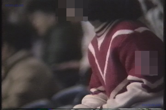 氷上格闘技の応援シーンより。チームチアの皆さんの演技。演技中のみならずスイッチオフの控えシーンなども。試合の合間か一旦上着を羽織りながらも下はスカート姿。そのから白いものが見えてくるスタイル。