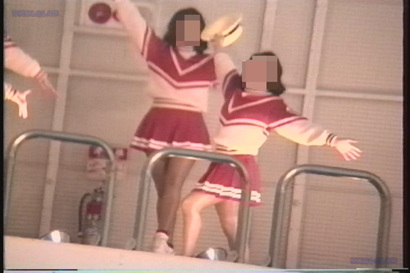 観客席再前方にチア、応援チームが登場する形。典型的なミニスカチア衣装から、チームユニフォームを模しながらも下は短パンの衣装娘も登場。シャキッと脚が見えるユニ風衣装がいい感じ