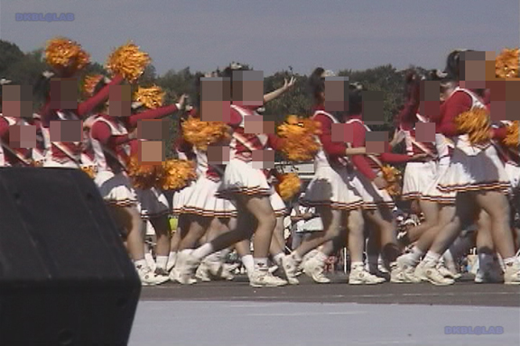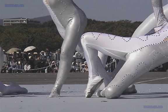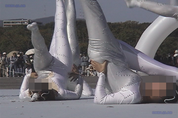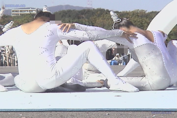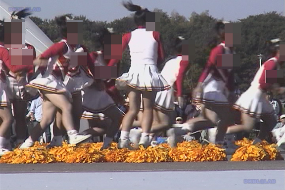 広々としたロケーションでイキイキの演技。赤白ユニのチア娘や白系のてかてか全身タイツの姿もございます。続いては4人組チアチーム。こういう演技の場合は長髪の娘でも髪はまとめ上げるものだという概念を覆し、長い髪を振り乱しながら演技をしている娘がかっこいい。