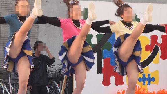 バトン部の演技から。自分たちのん儀が終わり、次の出番までの待ち時間時にもカメラは回り続ける…真顔のチア娘の演技中のキレっキレ時とは違うアンニュイな表情にご注目ください。中盤20分頃からはお祭りでのチア娘ですが最上級娘の最後の演技を兼ねているらしく、涙の最終演技となっており感動的なシーンです。そして32分頃からは、もうずっと出ているあのチアチームの様子がまたまた登場。今度は正面中央からの撮影。光線も過去何回かの同一シーンの中でも一番良好。