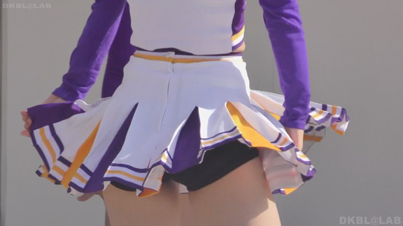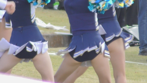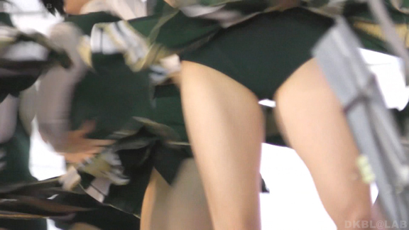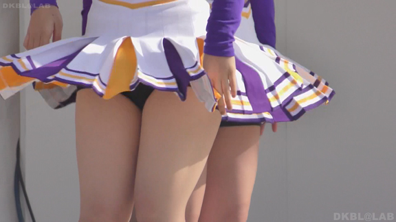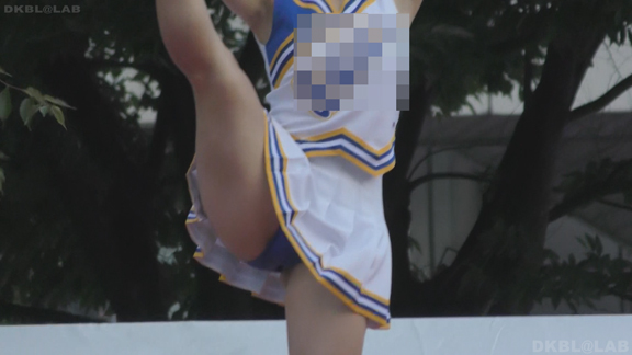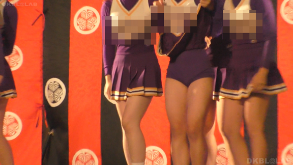 家紋が入った和風な屏風に白熱灯照明という古風なステージで紫地に白と黄色のアクセントチームが夜間演技。いかにもチアっ娘といった健康的体型(太すぎず細すぎず)が多くてかわいらしい。続いては陸上出発前の各団演技。カメラを振るといろいろなチームが撮影できるという環境。中でもプリーツ間が縫われておらず短冊形になっているスカートに紺のVアンダーというチームが最強。当日は風が強かったらしく、半分まくれ上がった短冊スカートが風にあおられなかなか元に戻らず紺Vアンダーが丸見えのまま、というシーンも多数。