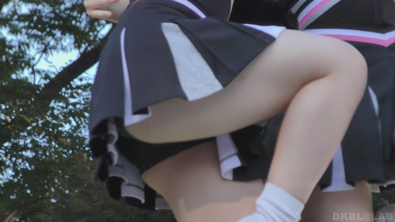 白ベースの短冊形スカートチームが登場。こちらも紺Vアンダー。風にまかれてアンダー見えたままシーンも再び。青ユニチームと緑ユニチーム、3有名チームのコラボ、これは必見!24分ころからは川辺の画像に切り替わり。こちらも出発前の応援。エンジがキャンパスカラーのチーム。こちらもノースリにエンジVパンで演技。