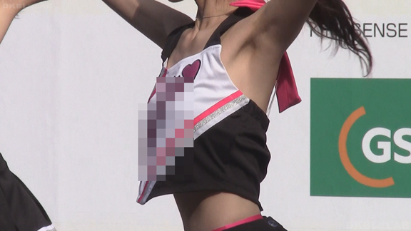 白と赤、水色ワンポイントのチームですがマイクを待って司会役のチア娘のむっちり具合がいい感じ。続いては白と黒に金色のアクセントがクールなユニチーム。タイトスカート風になっているのが少し面白い。アングル良好、時間も長く楽しめる。そのあとは雨の中のステージ。雨にもかかわらずノースリのチア嬢、孤軍奮闘。1人だけのチア嬢というのも珍しい。しかしむっちり体形で悪くない。