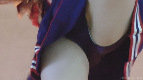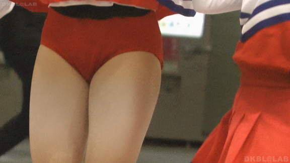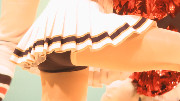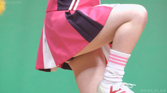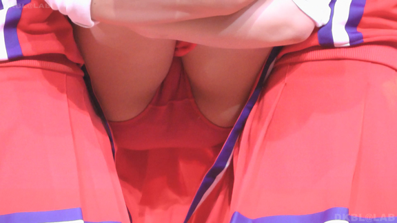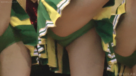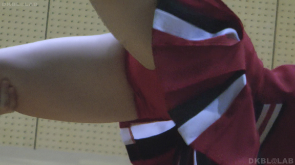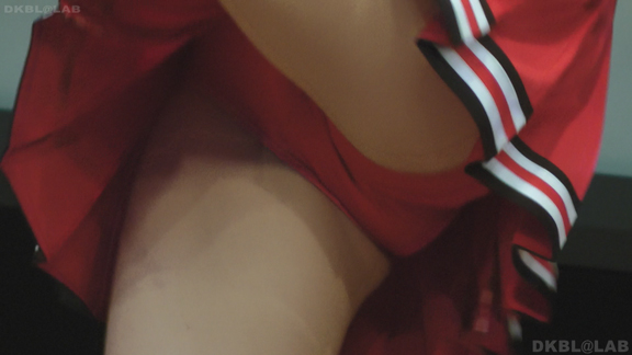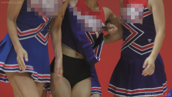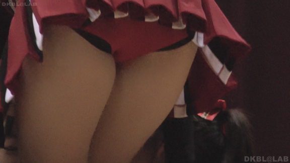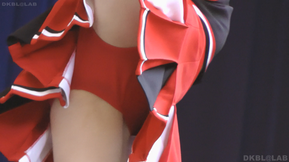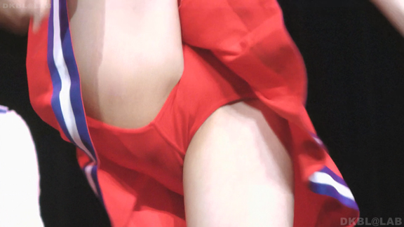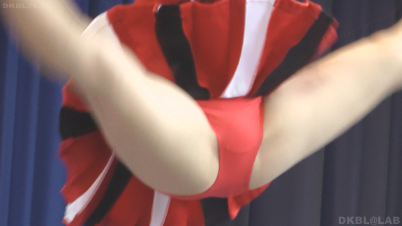 体育館ステージの演技。今度は青地に白と赤のストライプユニ。アンダーはコバルトブルーVパン。同一平面からの撮影でメンバーが多いためフレームいっぱいにチア娘の生脚とかわいいお顔が押し寄せてくるよう。後半は久々に外に出てまいりました。といってもコンコースのような半分外といったロケーション。呼ばれればどこでも行きます演技します!赤地に白と青のアクセントユニアンダーは赤V。後半は紺地に白と金色のアクセントユニ。アンダーは紺V。短冊形スカート。プリーツが切れているのでVパンが見えやすいのがポイント。こちらも室内演技。アンダーウェア非着用で脇チラも期待大。