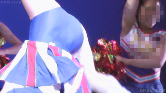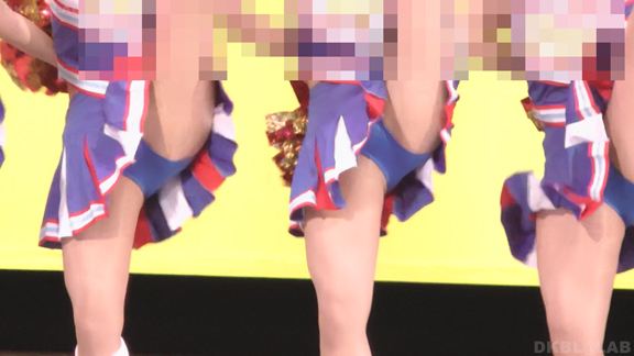 複数チアチームの混合演技。なかなかないコラボステージ。室内演技ですがカメラの性能の高さと光線の良さでまったく室内のデメリットなし。花紺色に黄色と白のアクセントユニでアンダーは花紺V。続いては暗転(真っ暗なステージがパッと明るくなって登場する)からチア娘が登場するという粋な演出でスタートのチーム。赤青の2トーンユニに白のアクセント。でなぜかアンダーは紺V。いきなり側転娘がいっぱいで紺Vアンダー見えまくり!
