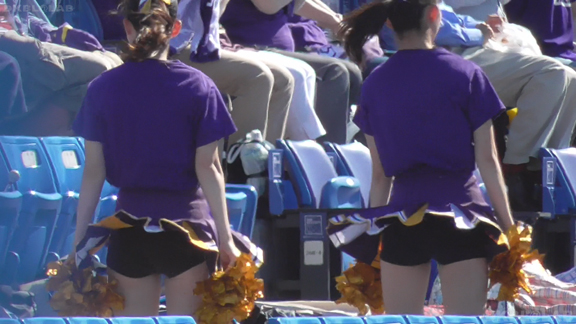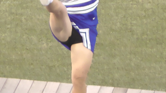 雨の中応援。汗が雨と混じって目に入ってきて痛い。目をぱちくりしながら懸命の応援。グリーンに金白アクセントユニ。そのあとは赤青白3色ユニチームが登場しますがこちらも雨。日差しによって光線が変になることがないのでじっくり見る分には雨天チアも悪くない。雨の中ノースリで演技しているのが泣かせます。次はライトグレー地にピンクと黒のアクセントという変わった色遣いのチーム。5から6人ほどの小世帯ゆえ仲がいいようで、チアユニを着た一般観客のようなゆるーい感じがグッド。いたずらをする後列の娘に前列の娘が反応、メガホンでいたずら娘をたたくコントのようなシーンがおもろい。(※本作品は一部音声が収録されておりません)