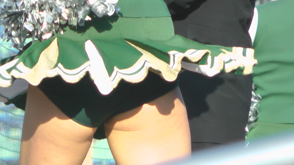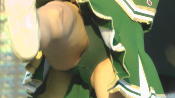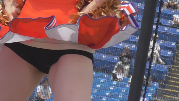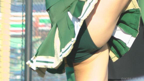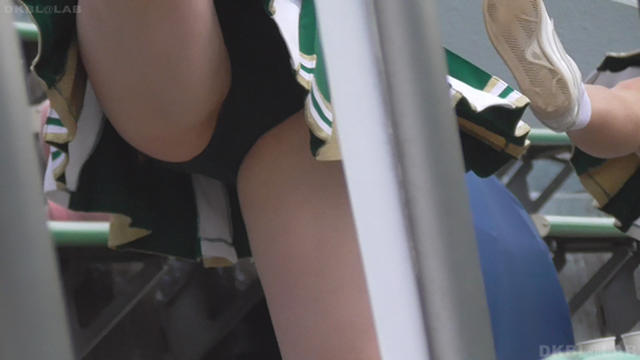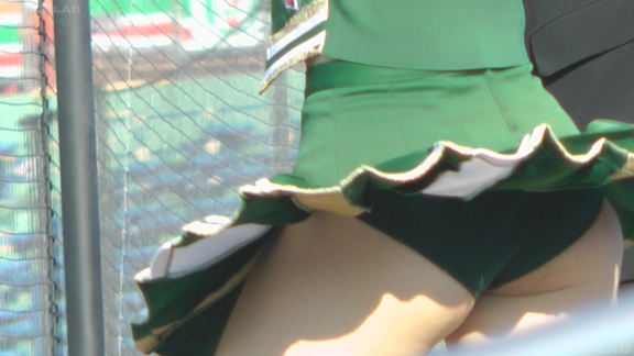たびたび登場しますグリーンに金白アクセントユニ。アンダーの緑Vがいい味を出しております。陽光に照らされた栗色の髪とつやつやの肌、そしてアンダーも良く見える!そのあとはスカートのひだが短冊形のユニチーム。沈む夕日をバックにした薄暮試合。ややカールのかかった長い髪をポニテに結って応援。アンダーはホットパンツ型の黒。(※本作品は一部音声が収録されておりません)