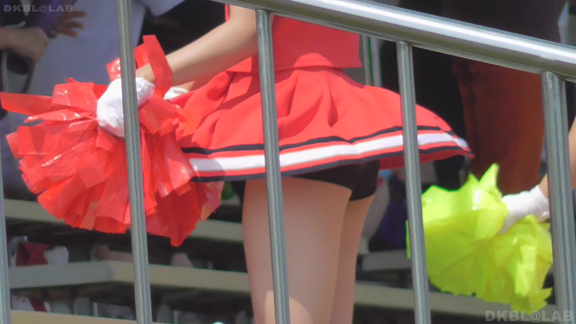 水かぶりチーム、水しぶきが見えるだけで清涼感が非常に上がります。ノースリチア娘の応援もさらにノッテまいります。続いては青と白のシンプルユニチームの様子後ろには色違い(赤)の同じ柄ユニ娘。特に青ユニの3人がかわいい。その後ろの赤2人もいい感じ。そのあとは赤と白のユニでアクセントに紺のラインのチーム。暑いのでお帽子かぶりましょうねーという感じで、かぶらされているような野球帽姿。後ろの穴からポニテを出しているのがかわいいですねー。見事にVパンなのが泣かせます。赤系ユニなので赤Vかと思いきやまさかの青V!かわいい娘も多く飽きがきません。