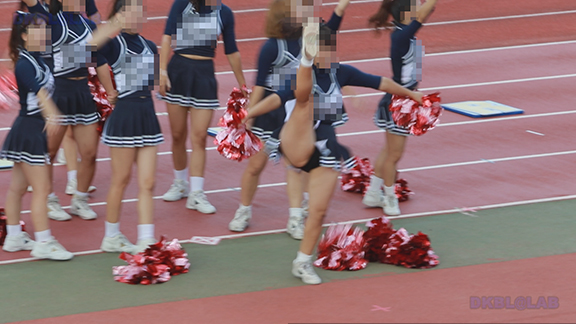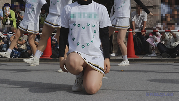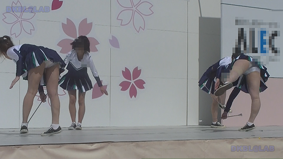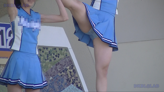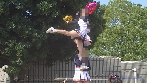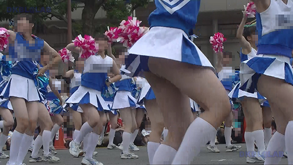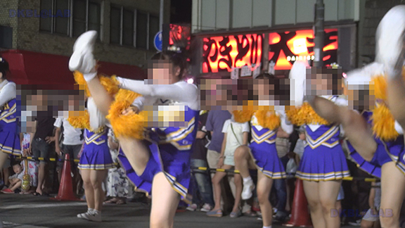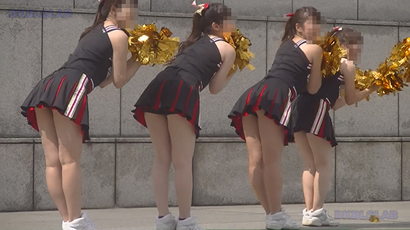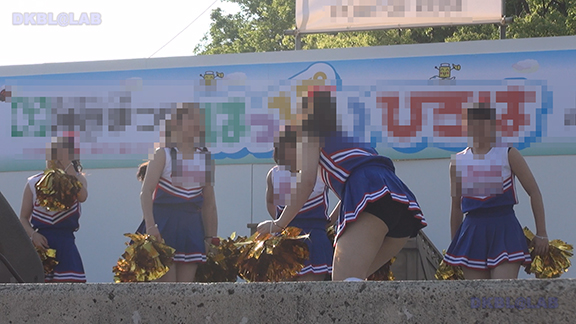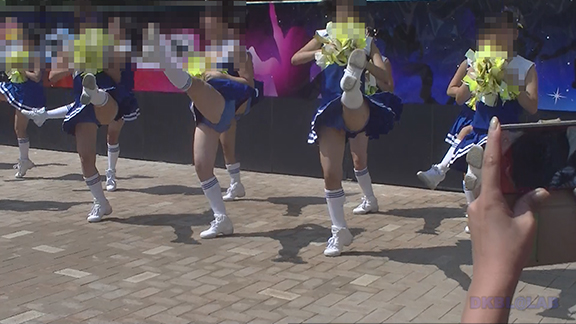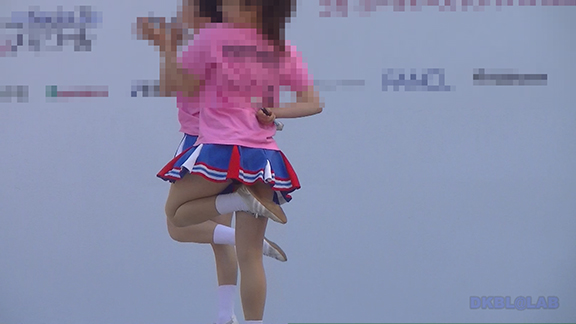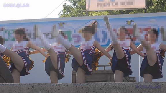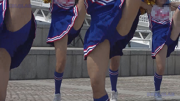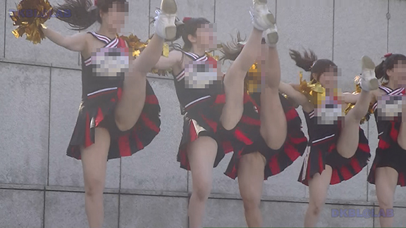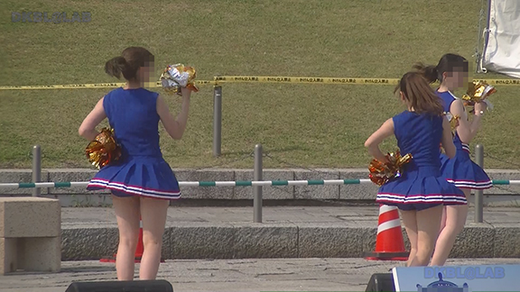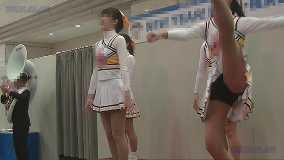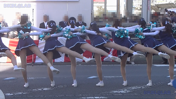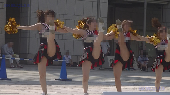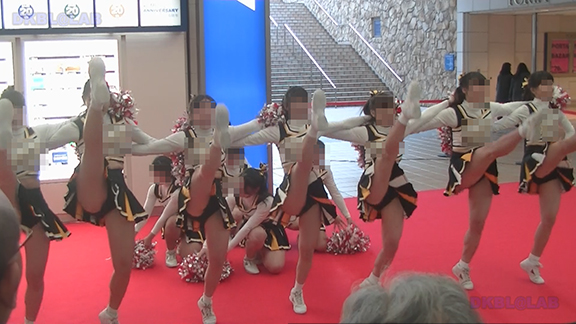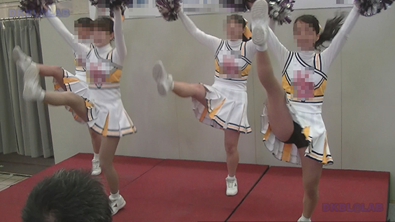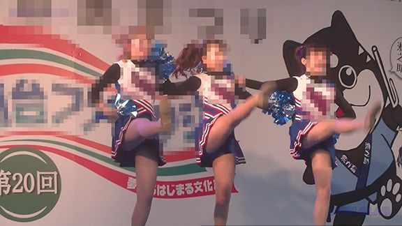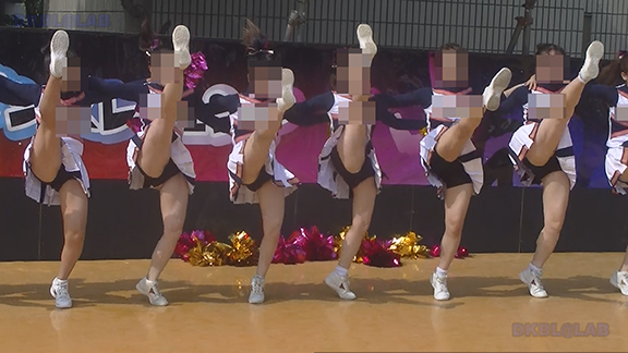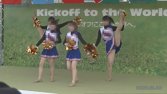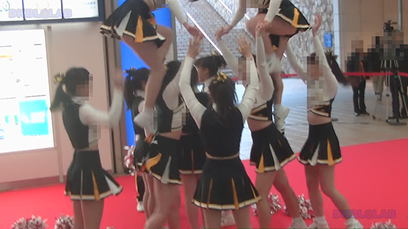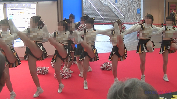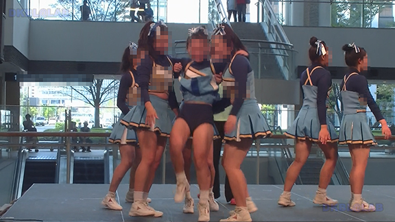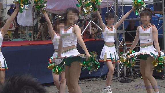 正月イベントでのチア演技。応援団ブラバン部隊も登場し本格的。白ベース黄色と紺のアクセントユニ。ステージ狭。距離近。チア娘は4人と少ないですが皆さん同じような体型の娘でそろえています。正月からお疲れ様です。終わったかと思ったら別アングルで同じチームの様子テイク2。黒白ベース黄色アクセントユニ、何もしていなくてもおへそが見えているセクシーユニ。Vは黒のホットパンツ型。こちらもくるぶしソックス。