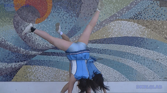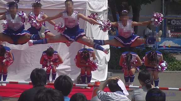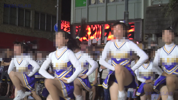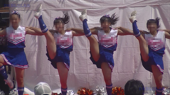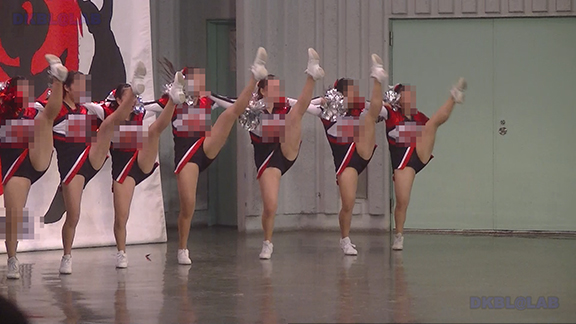 夜の街での演技。バックの赤ネオンがおいしそうですがチア娘の生足のほうがもっとおいしそう。明るい青ベース黄色と白のアクセントユニ。夜の演技ですがメンバーいっぱい。後半はタイツ一体型シューズで演技のチーム。一瞬裸足で演技しているように見えるのがポイント。最後は屏風バックイベント。