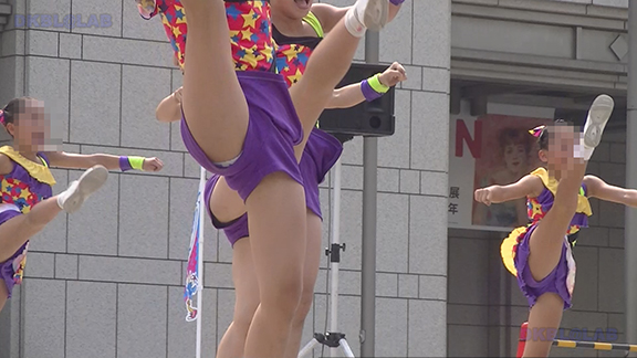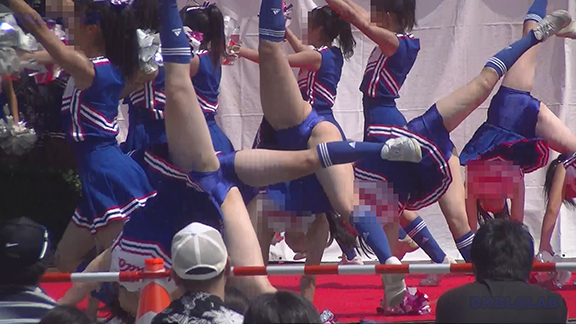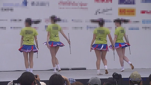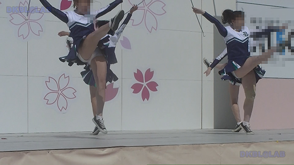 ビビッドな黒地に赤白アクセントユニ。スカートも黒地でひだの内側が赤という仕様で派手です。靴に隠れてほとんど見えないソックスがグッド。裸足の上にそのままシューズをはいいているようでとてもいいかんじ。中盤は似たようなカラーのユニ別チーム。タイトスカートユニですがひらっとしたときのアンダー御開帳が少なくなる半面、足上げの時はほぼ確実にアンダーが開帳。ステージ後半では吹奏楽チームにステージをゆずり観客席ベースの平面で演技する様子も。