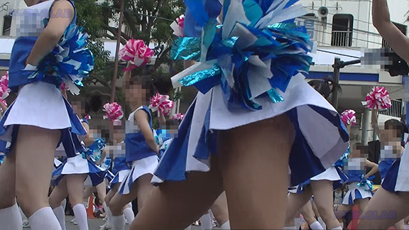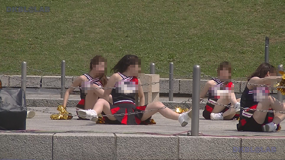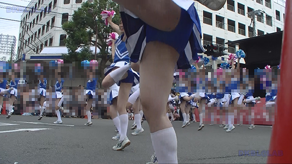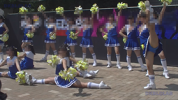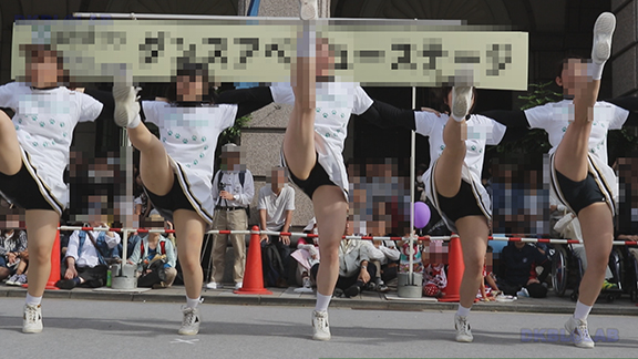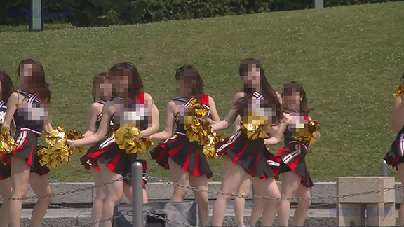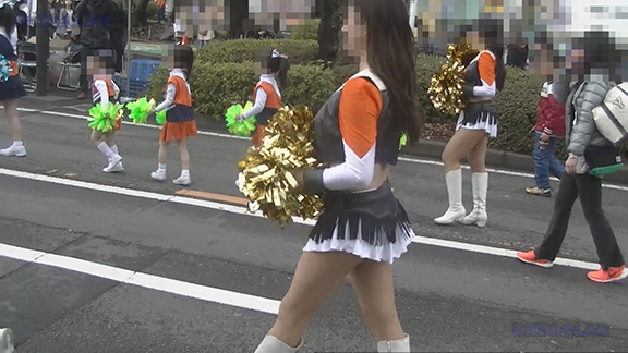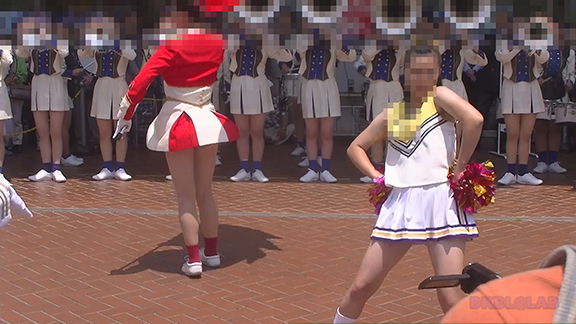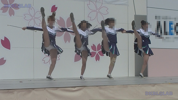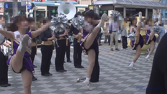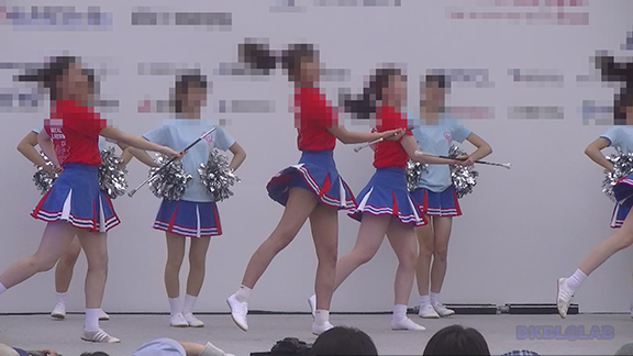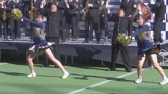 チア娘はもちろんぷっぷかぷー部隊の皆さんもひざ上10㎝程のスカートをお召しになったチーム。バトン部隊でもチア娘でももれなく足だし前提ユニフォーム着用、という潔さがよい。そのあとは黒地に赤白アクセントユニ登場。石造り風の荘厳な建物の下で青空演技。そのあとは場所を変えて同じチームが再び。このチームもかわいい娘いっぱい。場所がまた変わって違うチーム。踊りだしスタート時に前列左にいる娘が特にかわいい。