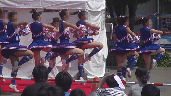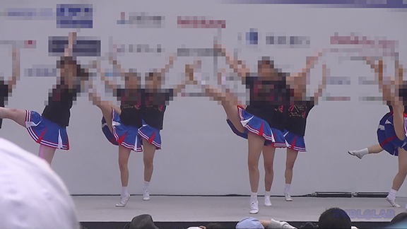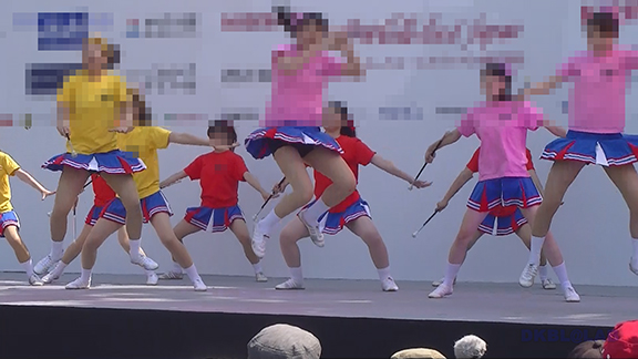 水色のユニチームからスタート。皆さん黒髪、かわいい娘もいっぱい。生足タイツなしにくるぶしソックスの清潔感。後半は夏休み中だから…ということなのか黒ベースながらもピンクや紫色がやや入ったお祭り用髪型で登場。ノースリーブで雨のステージを踊りきる。