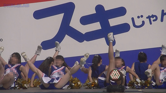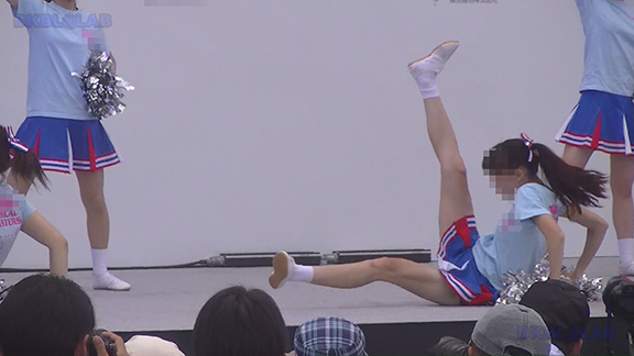 水色黄色に紺のアクセントユニチーム。ビギナー娘をステージにあげスタンツ体験コーナー開催とよくある光景ですがポンポンは記念にお持ち帰りいただけるようになっているのが新機軸。こちらも生足くるぶしソックスチーム。紺のVパン、バク転などもあって本格的演技。後半はかつての作品にも登場した白ベース裾に七色のレインボーカラーが入ったユニ。アンダーが緑Vというのが変わっています。