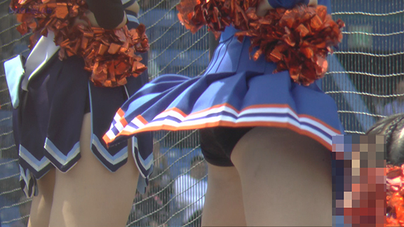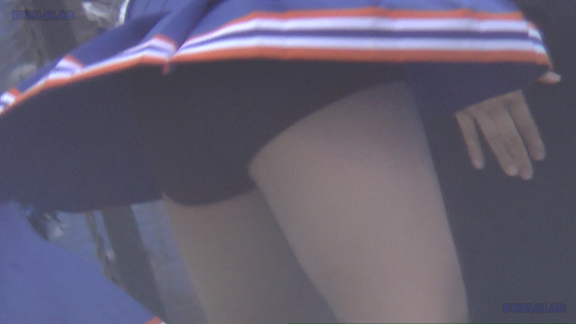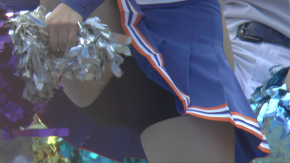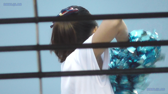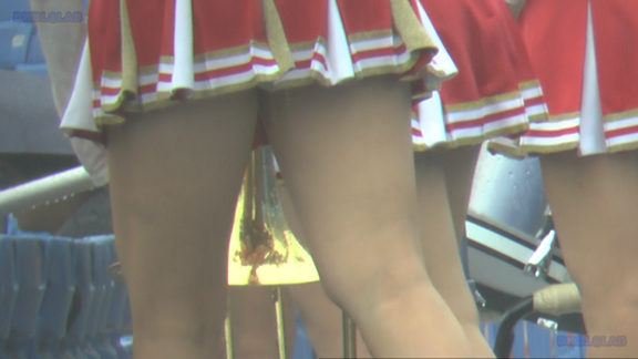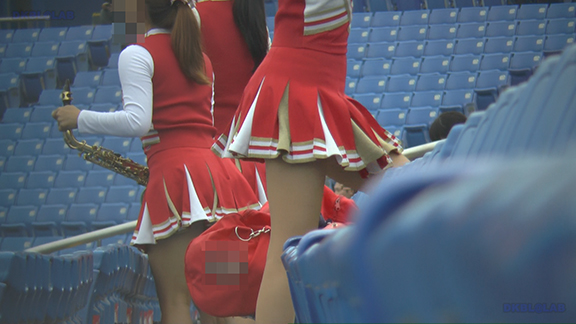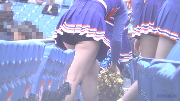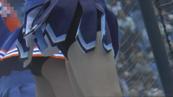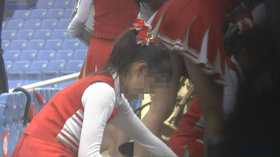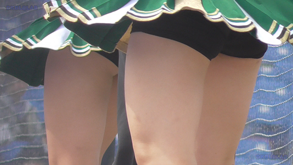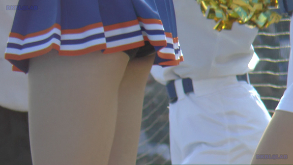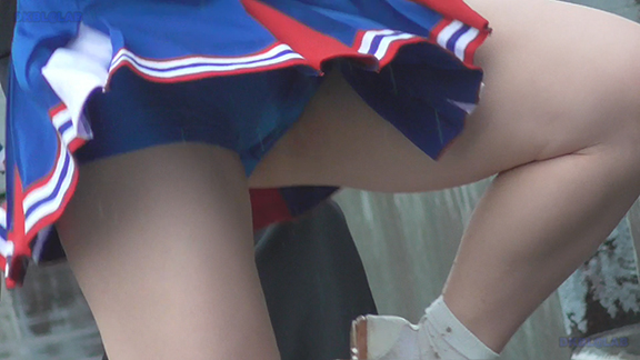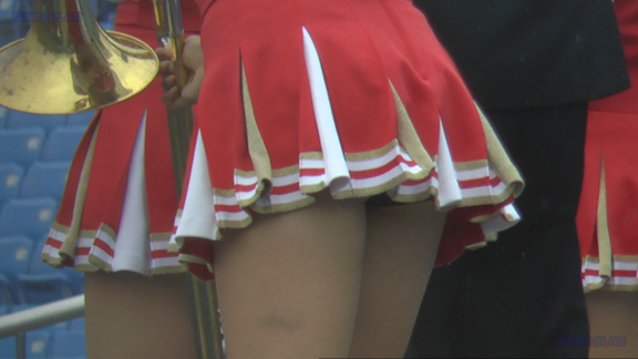 朱白金チームの続き。少し雨はやんできたか、傘もささずに濡れたままの応援風景に感動。トランペットプカプカ太鼓どんどん係もチアっ娘兼用。後半は紫かかった青に白赤アクセントユニチーム。一通りの応援を終えてちょっと休憩。今どきの娘、私服ではミニスカや短パンでの外出も多いでしょうからスパッツが見えていてもなんとも感じないのかスカートがめくれてスパッツチラ見えのままで休憩して居る娘がいます。