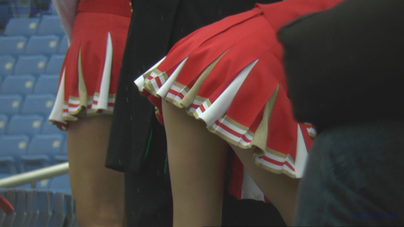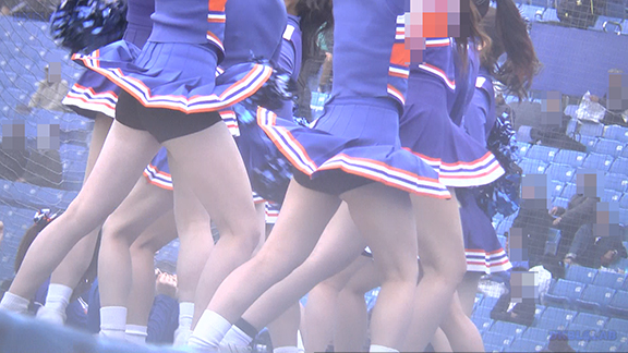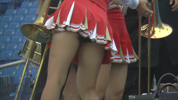皆さん前髪をきちっとそろえたポニテスタイルの髪型統一がかわいらしい。野球応援は長丁場なので数人ずつ休憩をしながら絶えず応援。休んでいる娘はスーツジャケット状の上着を羽織っていますが招集次第ジャケットを脱いで参戦。脱衣シーンってなんかドキドキ。