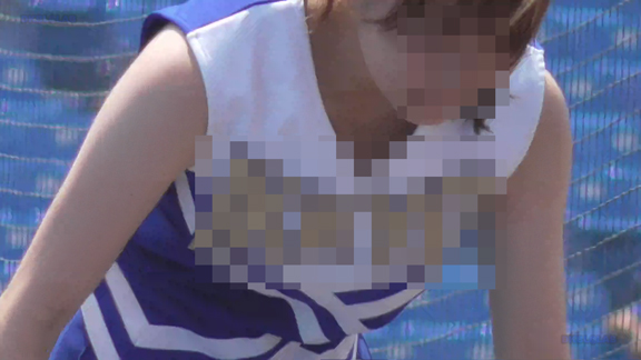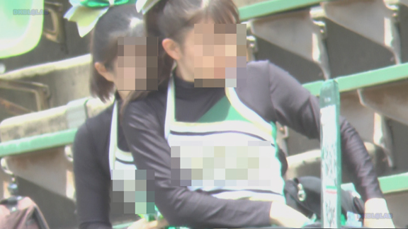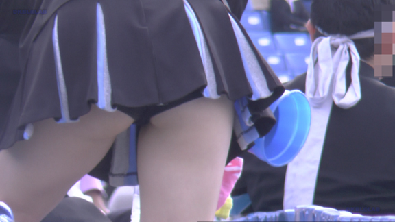 試合終了につき撤収の様子。果敢にチャレンジ。荷物をまとめるのに夢中でアンダー部の防備がまるでなっておりません。続いては野球ユニチアでの応援風景。通常チア娘は紺ベース白と黄色のアクセントユニ。33分ころからは水色ベース頃白のアクセントユニ。ポニテの似合う黒髪肌白娘がノースりで懸命に演技。