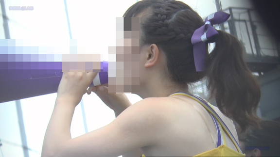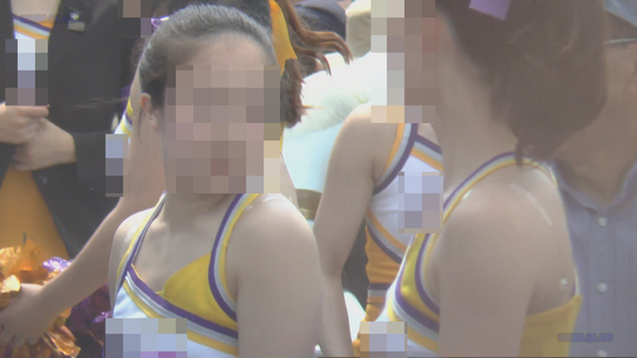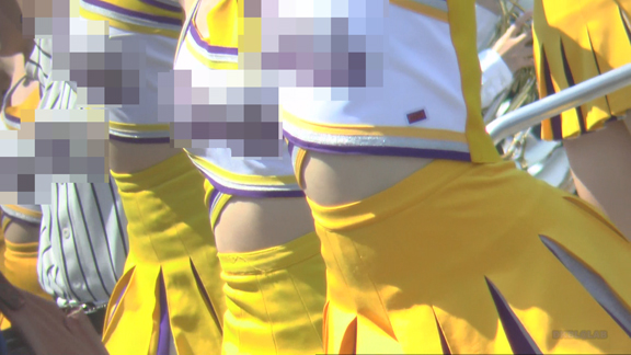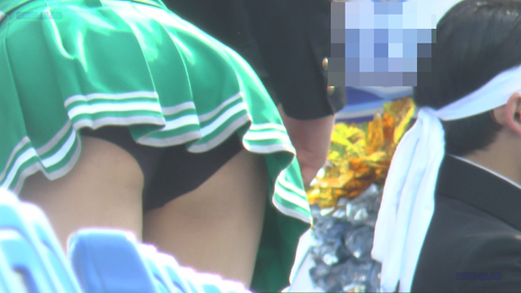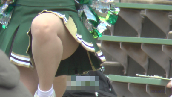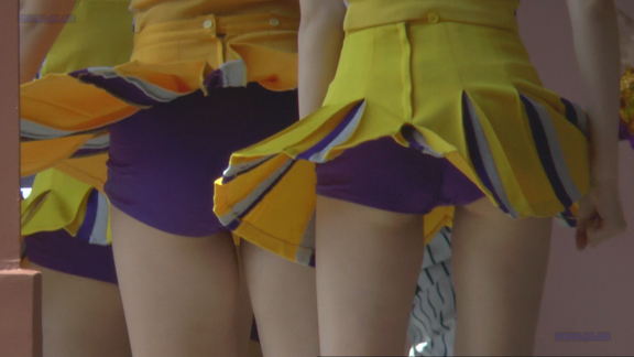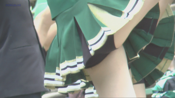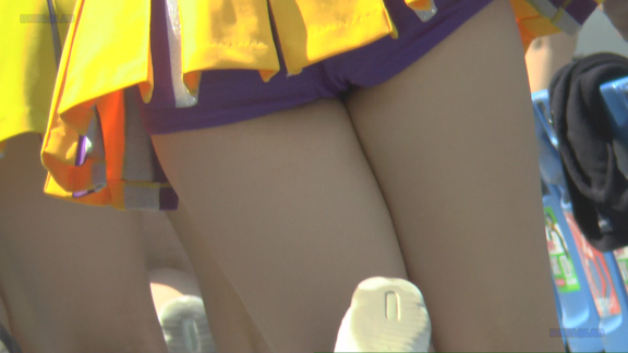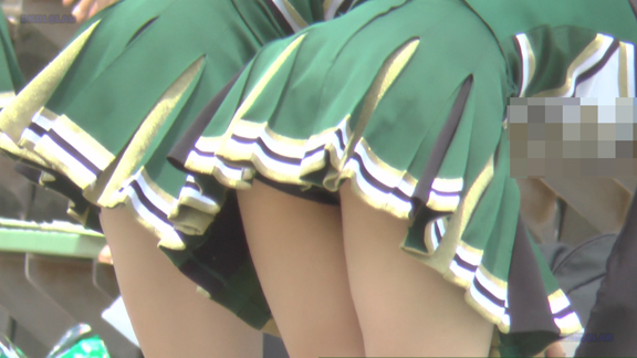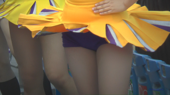 黄色チームが登場!こちらもノースり生足全開脇チラしまくり演技。アンダーはV 紫っつーのがそそります。後半は緑黒白金のチア。くるぶしソックスが激しい演技で靴に入り込んで裸足の上に直接靴を履いているようになっている娘も。一段下がった位置から足を中心に頂いているショットあり。