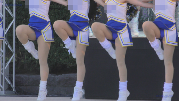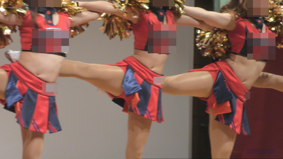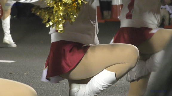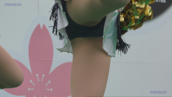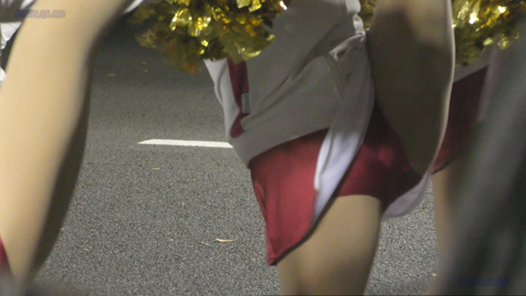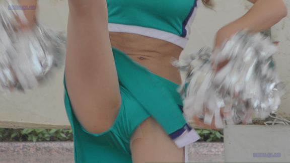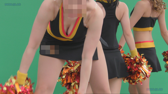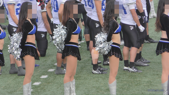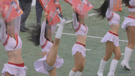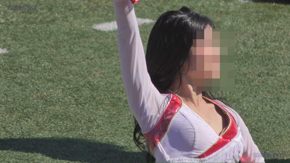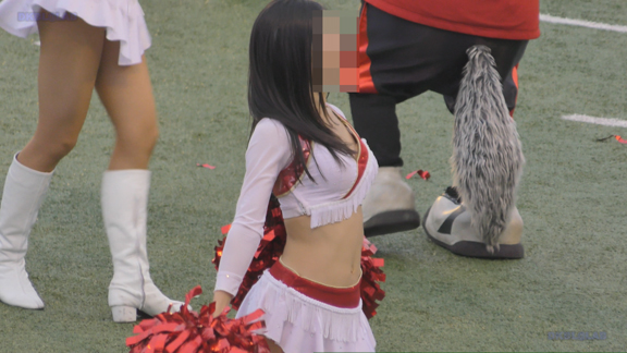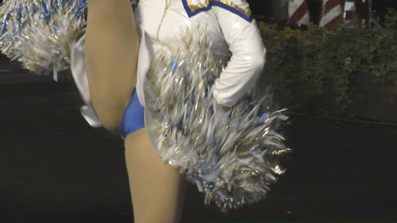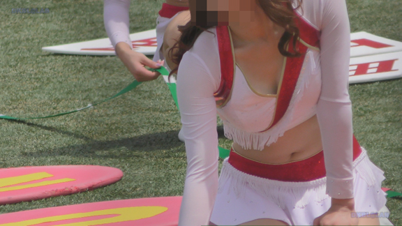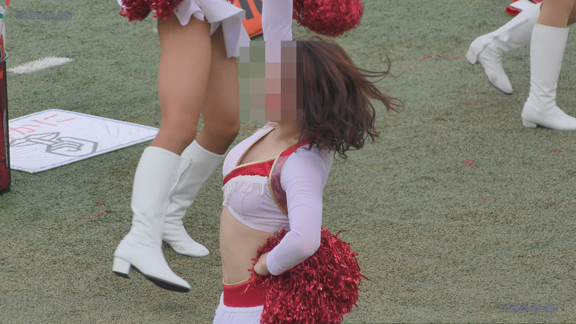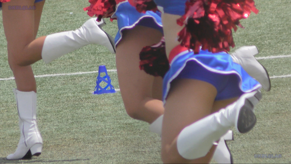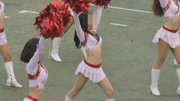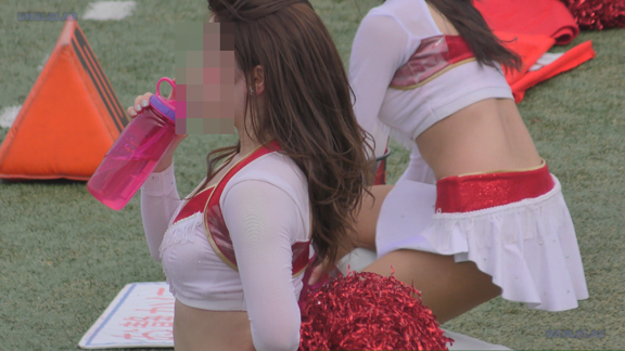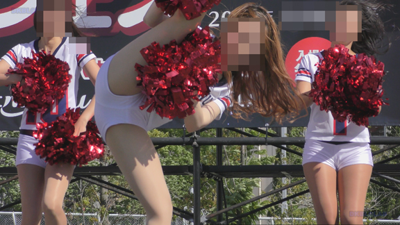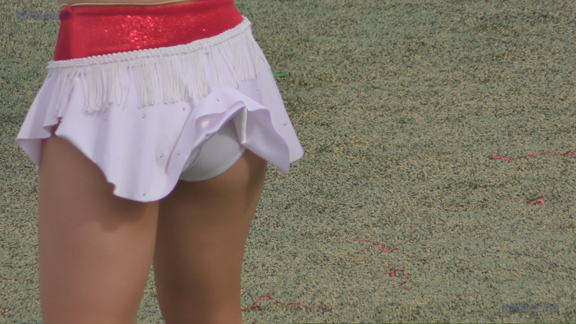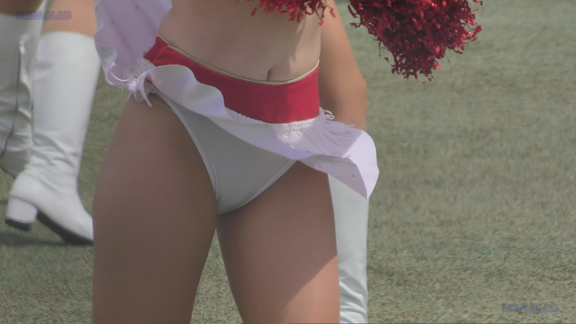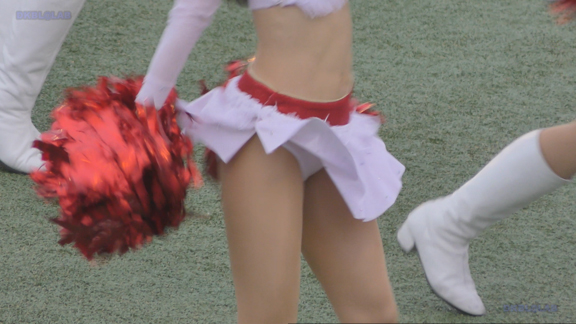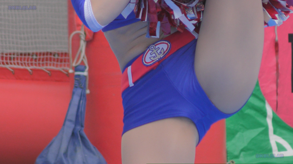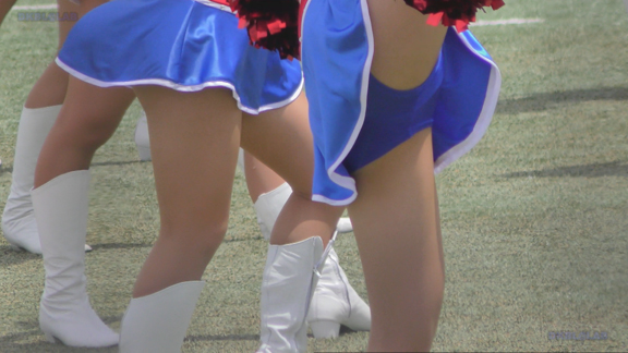 白アンダーチームの応援が本格スタート。ハーフタイムショーではなく試合中ピッチサイドで常時応援のスタイル。そのため長時間連続スイッチオン。風も吹いており非常にいい条件で白Vアンダー見えまくり!!!天候も曇りで白飛びがなくこれも好条件です。後半は常時へそ見え白スカートのチア嬢の様子。そしてアンダーは青V。超食い込みVパンがgood!