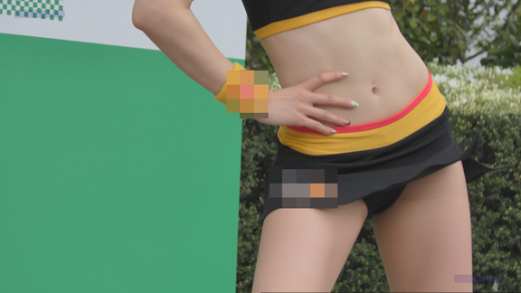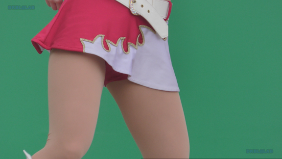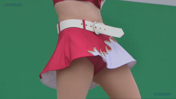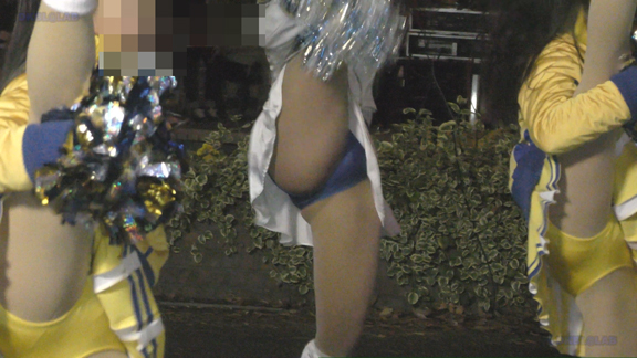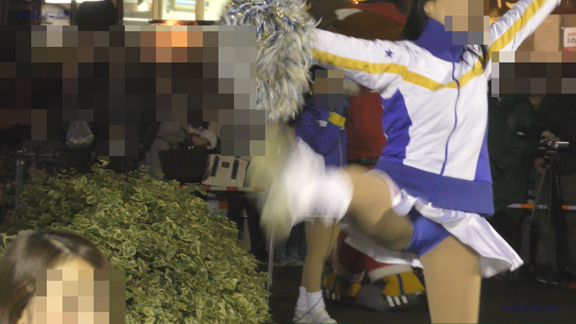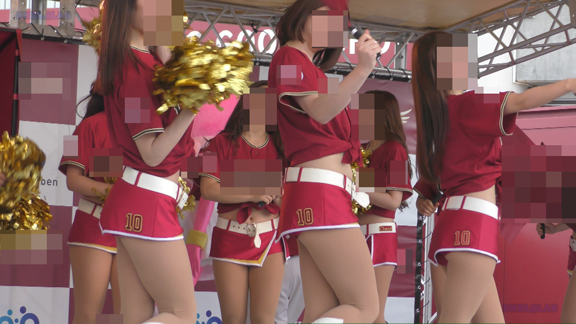 イルミピカピカイベント。いきなりチア嬢とハイタッチ。和気あいあいシーン。後半はユニ風上着を裾で縛ってわざわざへそを見せている衣装に超ミニ短パンの組み合わせ。