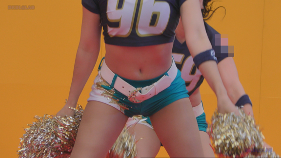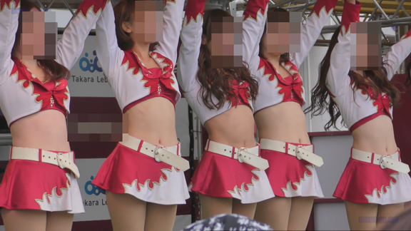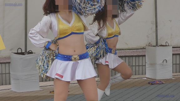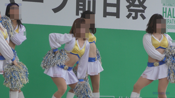 脇を固めるおねいさんはほっそりスタイル、おなか周りをへそ出し衣装でアップデート。後半は都市チームチアにスイッチ。まさに双璧。これを同一会場でみることができるとは幸せ者です。ほんわか美女のへそ出しチアダンス。