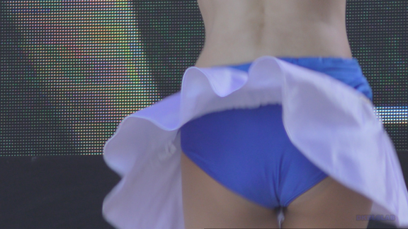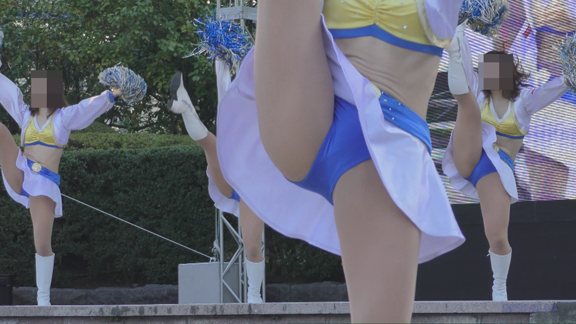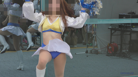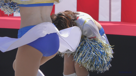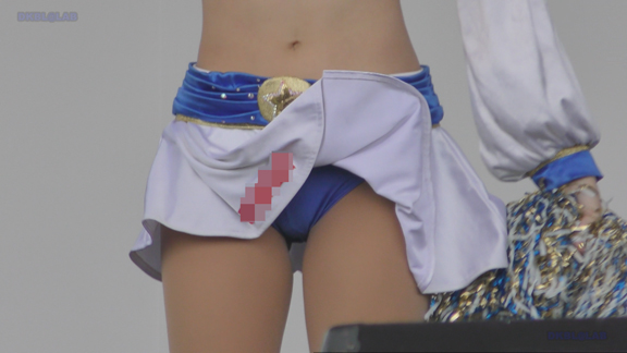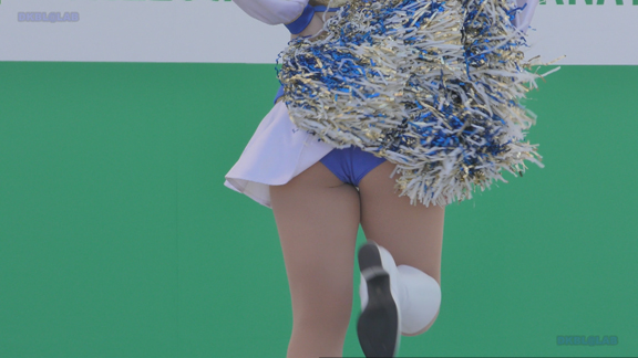 へそ見え白スカート姿、アンダー青Vのチア嬢。かなり激しい動きを入れたダンスで青のVパンがチラッ、ちらっと見え隠れ。イベントの大小にかかわらず統一安定した笑顔で演技するプロ根性、あっぱれという感じです。