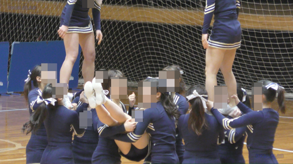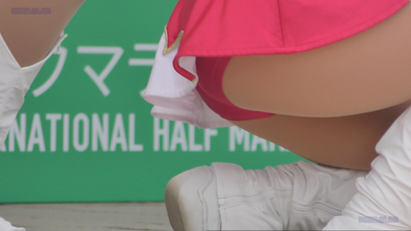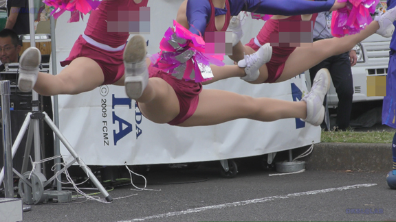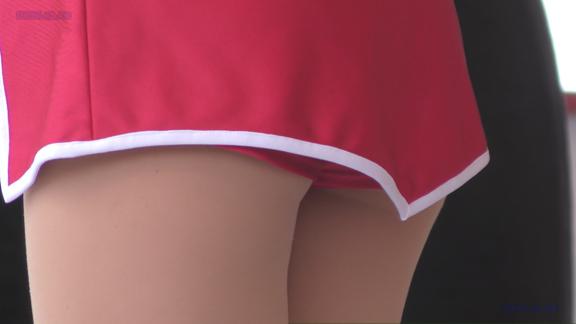 スリットの入った明るいワインレッド地のユニのチア。アンダーもワイン色。アスファルト地面に直接体をつけてアクティブなダンスを披露。後半は白アンダーのチアの応援チアです。準備中から映像をスタート。なぜか準備中シーンは本番の時より萌えるのです。