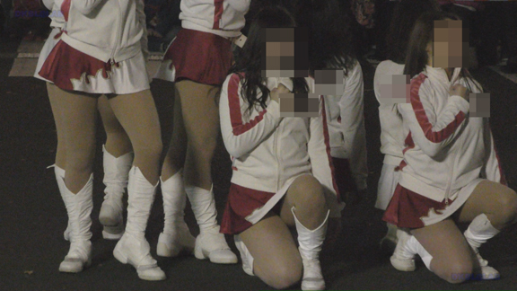 冬のイベント。都市で行われるイルミピカピカイベントをもさらに盛り上げるべくチアの皆さん登場。サンタ帽子がかわいい。さすがに普通のチアルックでは寒いので上着は着ているもののブーツからちらりと覗くおみ足がセクシーです。