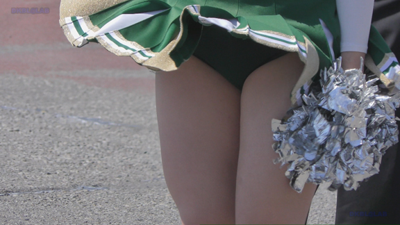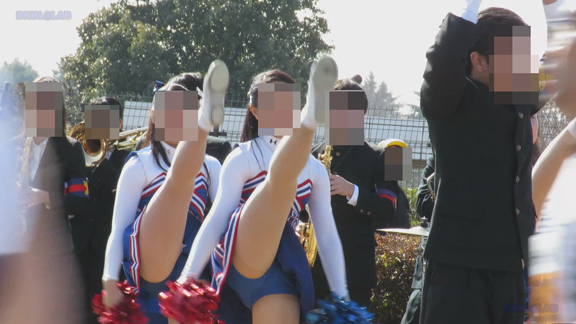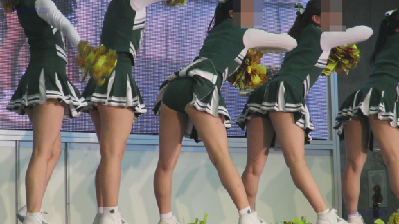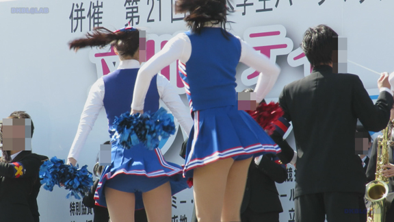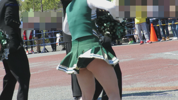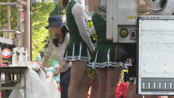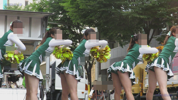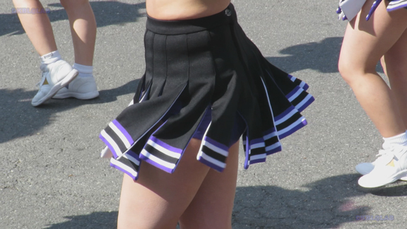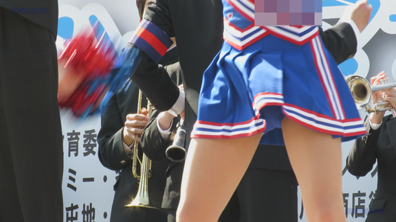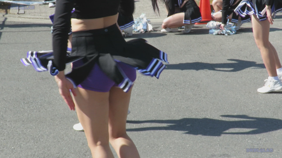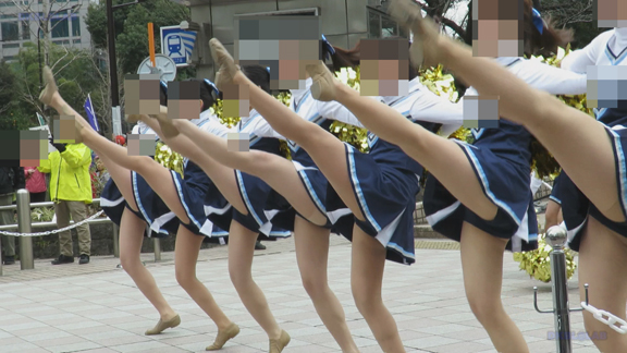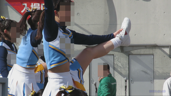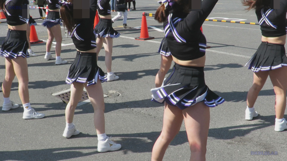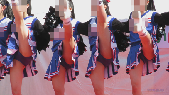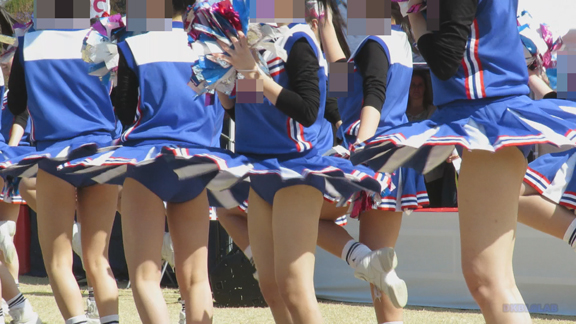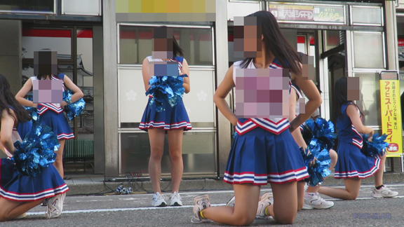 前半はマラソン応援のため、ずっと応援態勢、しかし疲れも見せずはつらつ演技が続きます。後半は空き地のようなローカル感満点の場所での演技、青ベースユニチームのチア娘。スパッツタイプですがタイツなしとショートソックスがいい感じです。