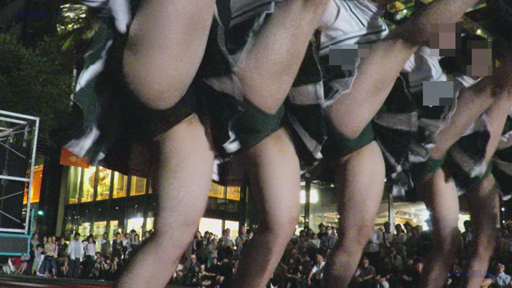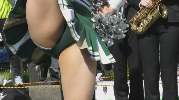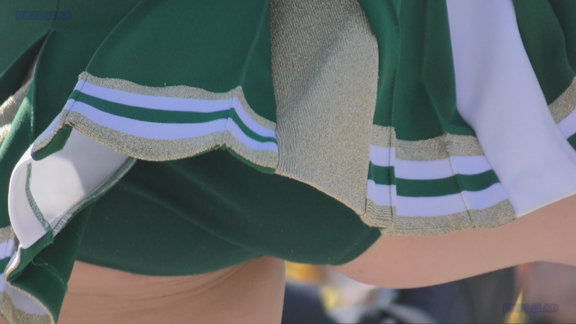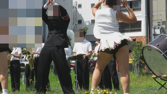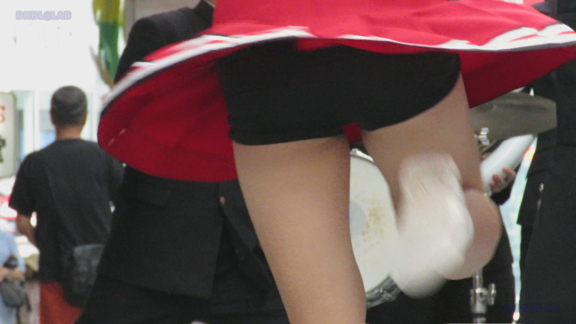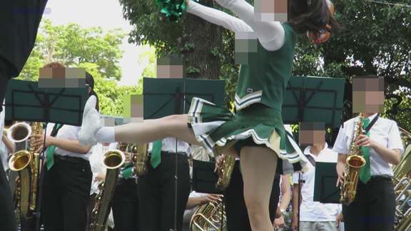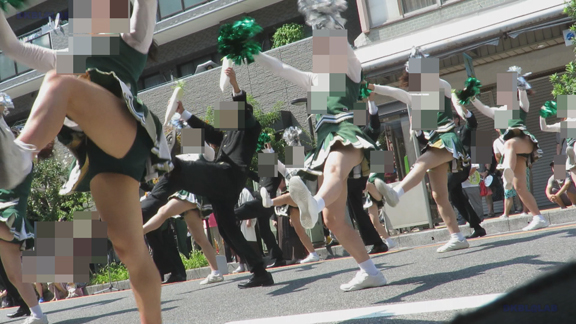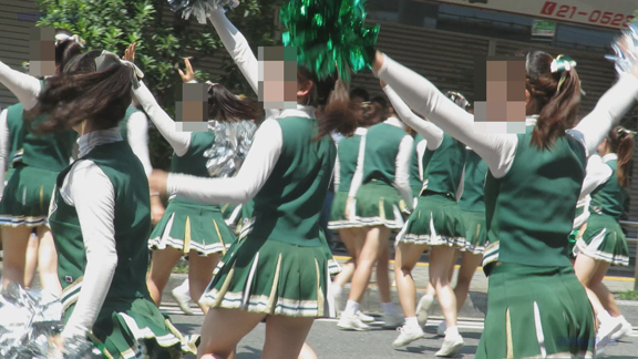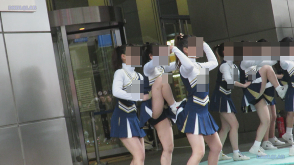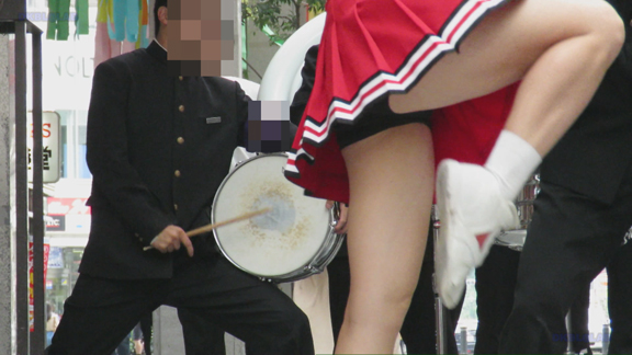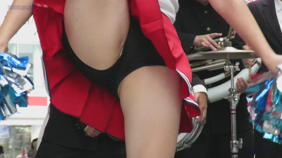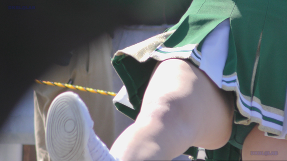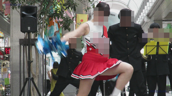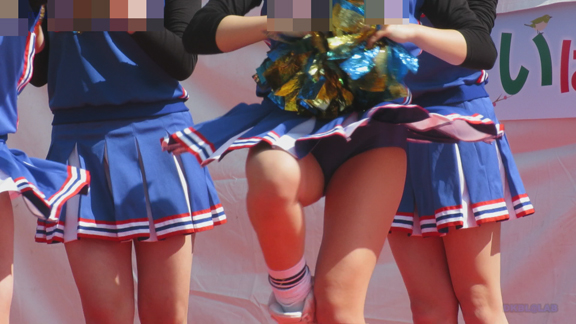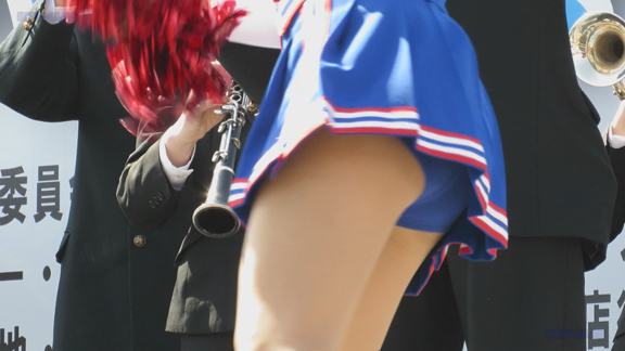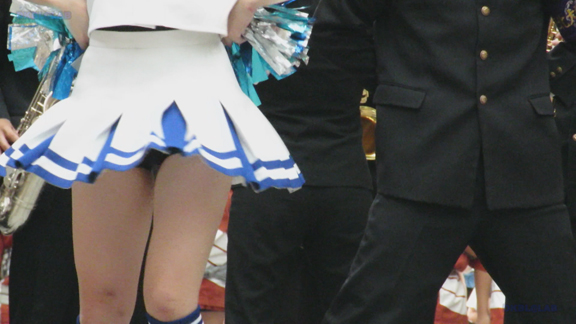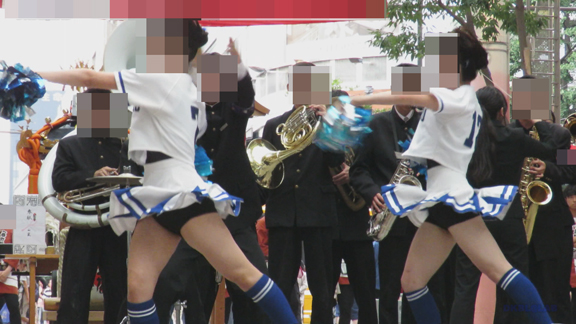 前半はマラソン応援のため、ずっと応援態勢、しかし疲れも見せずはつらつ演技が続きます。後半は空き地のようなローカル感満点の場所での演技、青ベースユニチームのチア娘。スパッツタイプですがタイツなしとショートソックスがいい感じです。