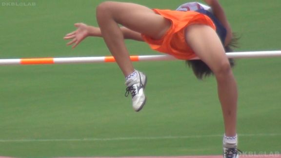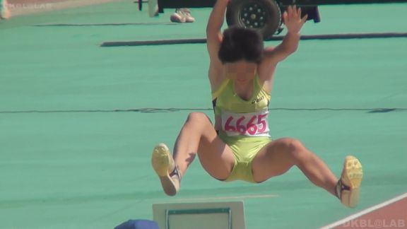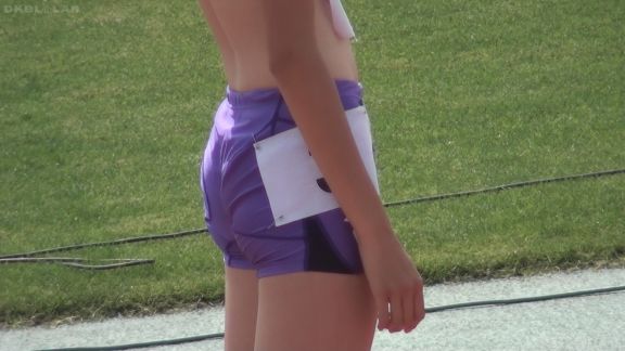 こちらも注目の緑単色Vパン娘のシーンから。アシッ○スの白いロゴが絶好のアクセント。1着でゴールした赤ユニ娘もなかなかのくいこみぶり。しばらくトラック競技が続きましたが38分頃からは久々のフィールド競技。高跳びの様子。茶髪のやや擦れた感じの娘が紫Vパン姿も凛々しく跳躍。スパッツ姿ながら黒髪、ロングのヘアをシンプルに結んだスレンダー娘との共演。たまにはこういう娘もいいでしょう。ややたっぷり目の体型もぷりぷりしていておいしそう。そして幅跳びのシーンではブルマタイプユニ娘が!!!かつてバレー部がブルマだったころは緑の薄生地ブルで有名だったチームですが、その後輩にあたる娘がブルマで復活!(ただし陸上チームは紫ユニです)練習着との日焼跡くっきりでこれも好印象。