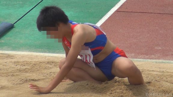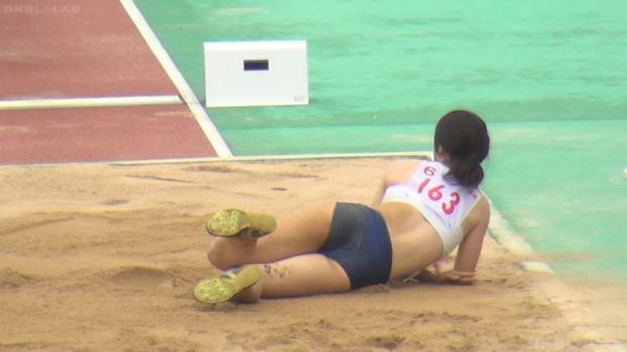 跳躍競技から。ハイビジョンの高画質で着地で付いた砂粒まで見えるほどの高詳細画像。紺地に朱のライン、青に赤ラインの両Vパン娘が砂で汚れまくる!!13分ころまでたっぷり。その黄色アクセント青Vパンチームが今回も躍進。出場時に計量でもあるのか、と思うほど、きれいに同じようなスレンダー&ショートカット娘が集うのがホントに不思議。リレーの時に締める紫の長めのハチマキもいいアクセント。