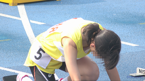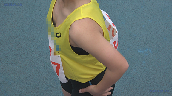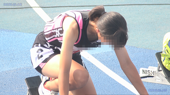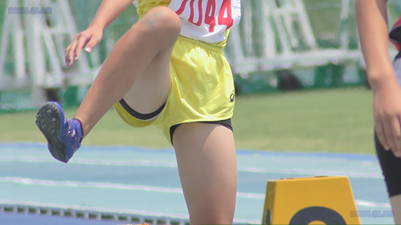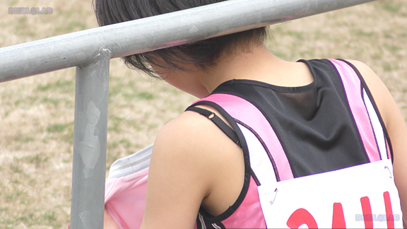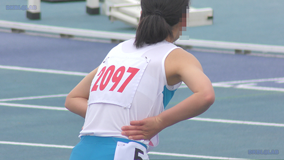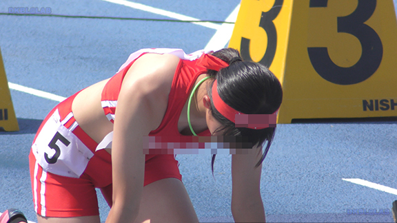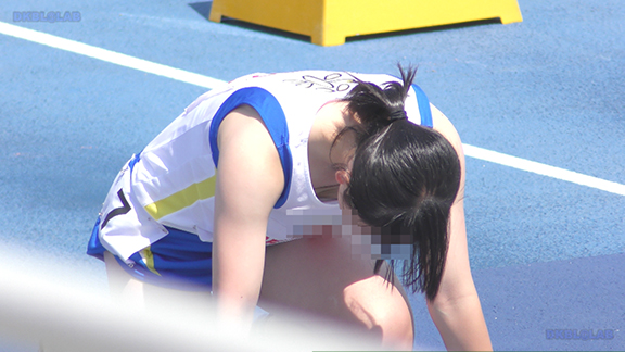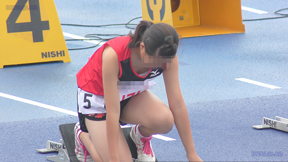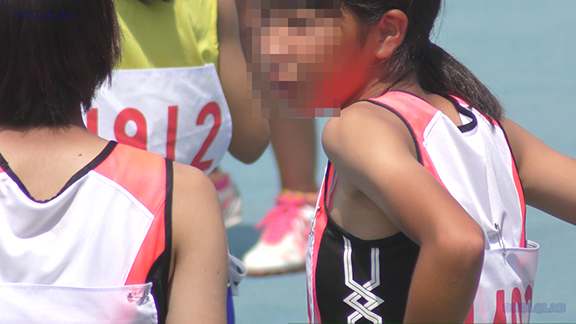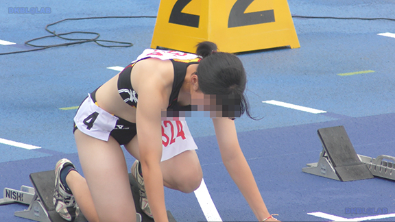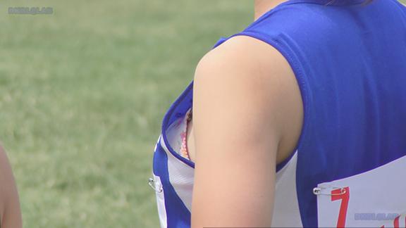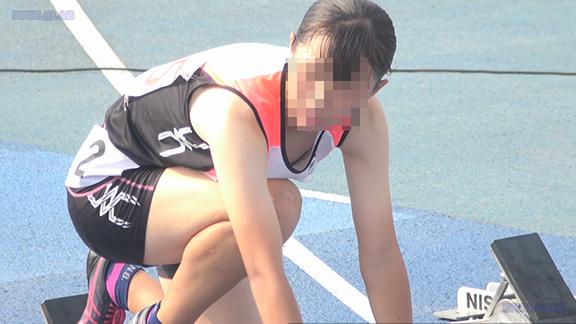 スパッツちゃんですがユニ姿でなければ陸上やってる感じが全くしない地味かわ娘。スパッツですがスタート時に上着から白いものが丸見えになっていてマイナスをフォロー。青ユニ娘も地味かわ娘も負けじと白いものを出して応戦。
