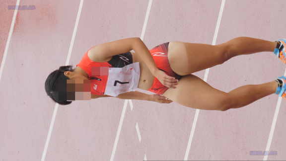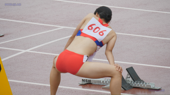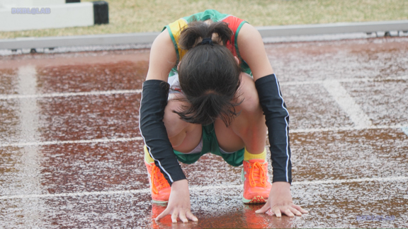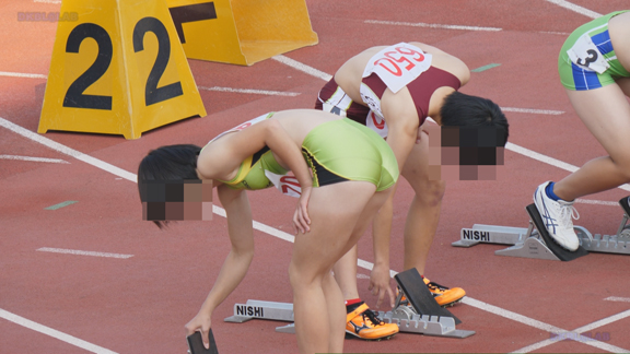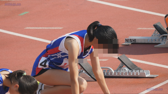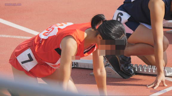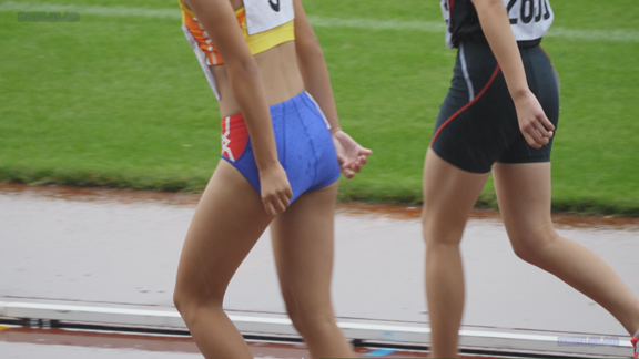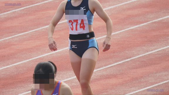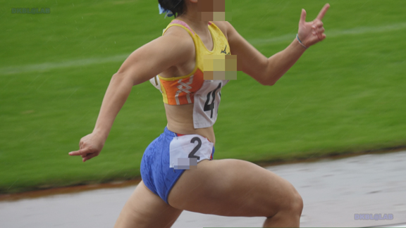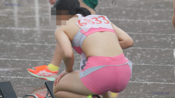 曇り条件なので光線が少なくコントラストが強い分、Vユニ周りがクッキリ。季節は夏でいつもはスパッツ等で練習、いざ本番ではⅤユニにチェンジ、日焼け跡もよりクッキリ。そして天気は…じゃんぶりの本格降雨、しかし中止はない。雨の中ストイックに記録を追っていく姿が健気です。後半はいい天気、ランパンユニ娘がいっぱい登場します。