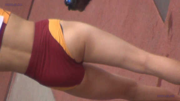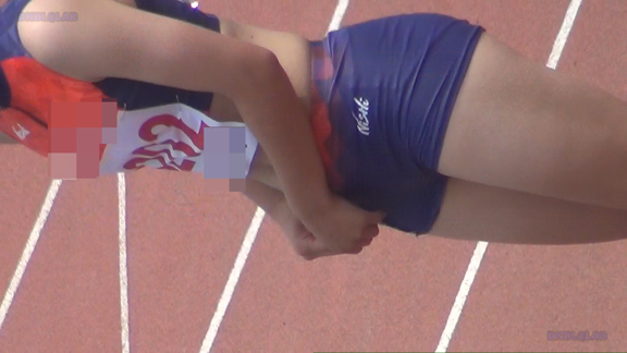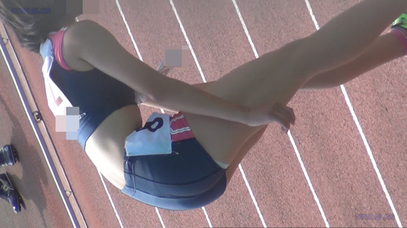 いきなりの本番前のシーンから!そして超アップで緑Ⅴユニ娘がドーン!と登場!続いてはオレンジⅤユニとカラフルに展開!紺地黄色ラインVユニチーム娘が登場!衝撃シーンがしょっぱなから連発です!お次は高跳び出場の黒に臙脂と白ラインVユニ娘のシーン。跳躍終了後、青いTシャツを着用しますが鉢巻きをつけたままというお姿がステキ!41分ころには青地黄色Vユニ娘が400Mリレー終了後、Ⅴユニ&スパイク非着用裸足姿でこちらにやって来るシーンがほのぼのとしてGOOD!